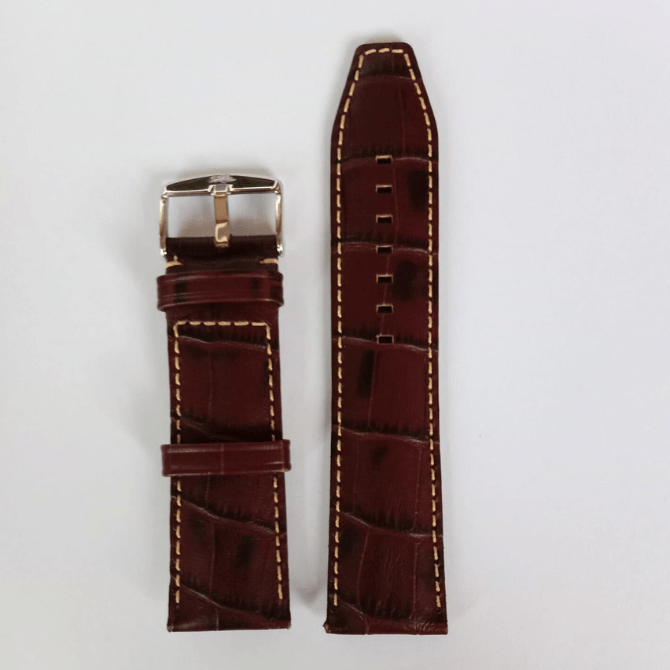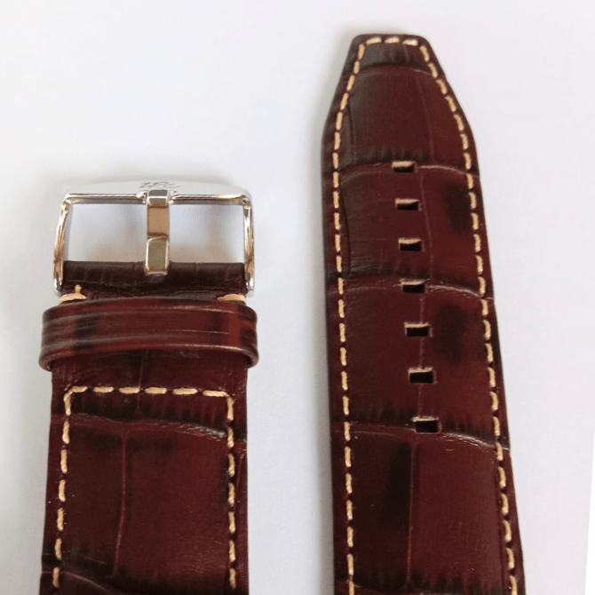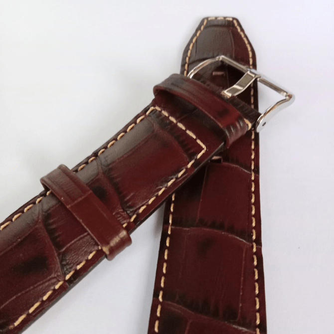 Bracelet de montre de la marque ZRC en Cuir de Veau Grain Alligator Marron foncé en taille 24 mm. avec surpiqure blanche. Bracelet Fait à la main